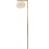 Alba floor lamp designed by Mariana Pellegrino Soto for Oluce. The shape of the lamp is reminiscent of a drop of water and the world of nature. This floor lamp is available in two different versions, one arm or two arms. In both versions, there is a large rectangular stem section that is made of brass, ensuring stability. The base is made of Anthracite. In the two-arm version, two arms are available at different heights that support the spheres. A black universal dimmer is included. The lamp can take up to 60 W Medium base bulbs. The shade material is in white polished opal glass.