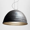 Babele pendant light was designed by Marc Sadler in 2005 for Martinelli Luce. This lamp in turned aluminum is painted with various shades of micaceous color, golden inside. It forms a hemisphere so that it spreads clear and sharp light outwards from the center. There is a steel cable for suspension from the top.