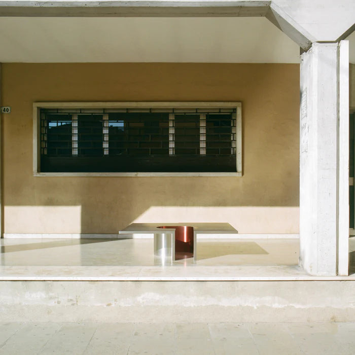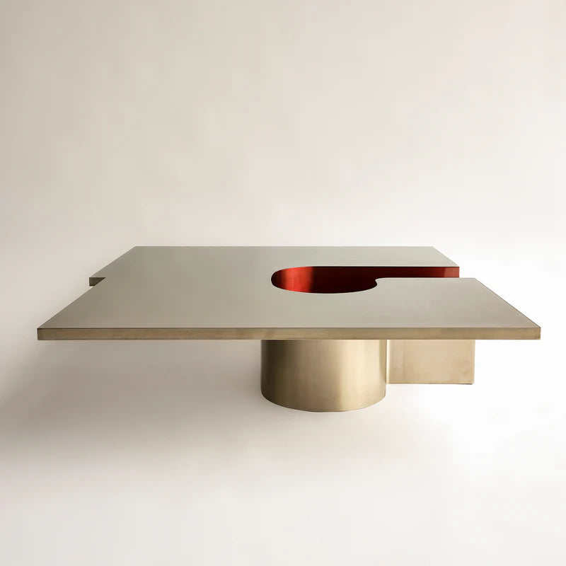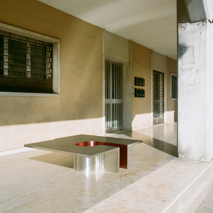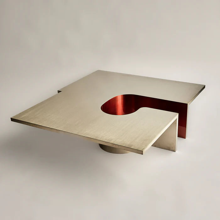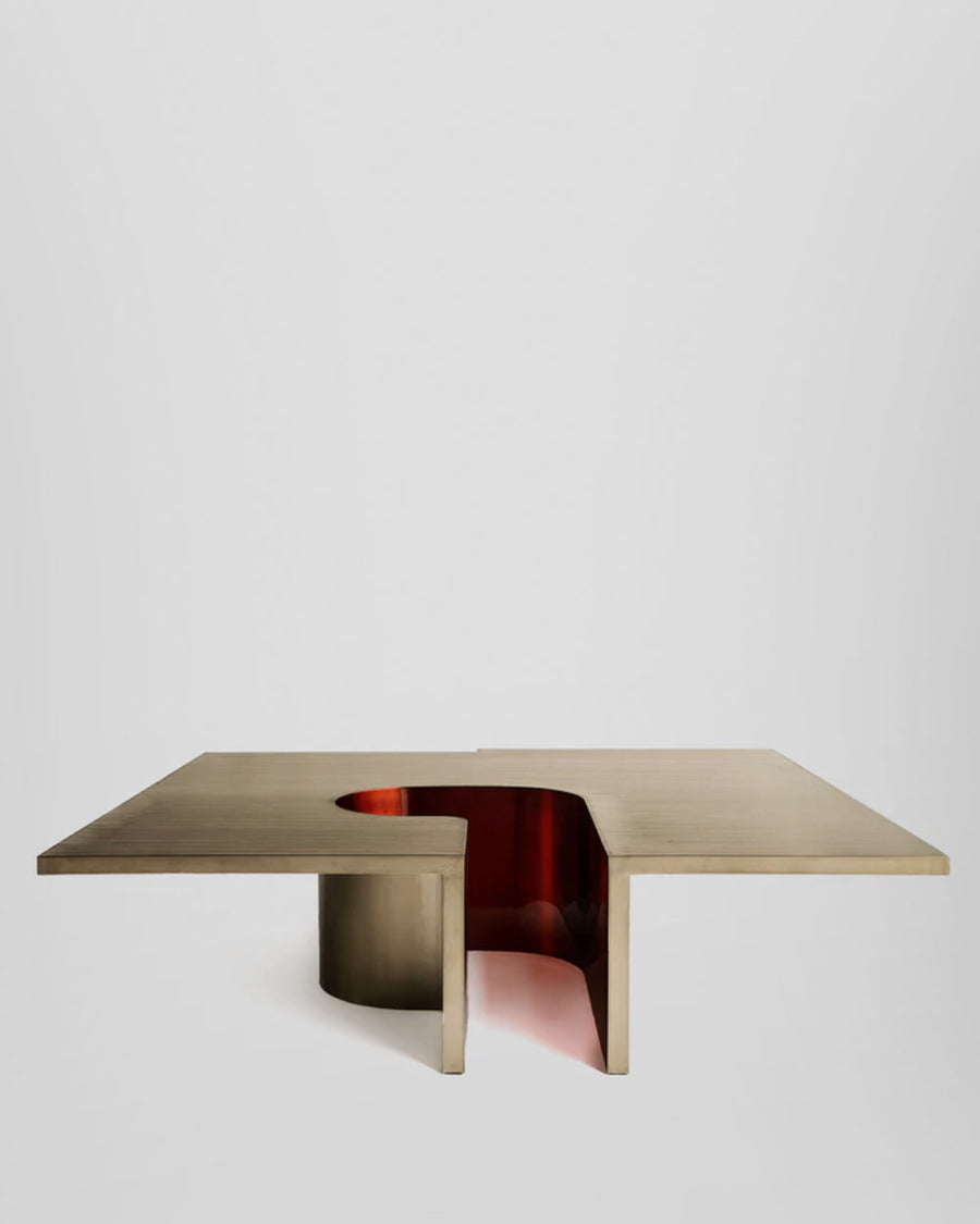 Roe_Table is a monolithic coffee table in satin-finished stainless steel and Sangue di Giuda finish in the central shaping that serves as the leg. Entirely bent satin-finished and hand-pigmented, it is a sculptural piece unique in every element, ideal for centerpieces in both domestic and hospitality settings.